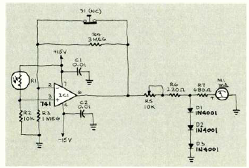 Usando un LDR como sensor, este circuito es de la revista Radio Electronics de diciembre de 1984. El amplificador operacional es el 741 y la fuente debe ser simétrica.