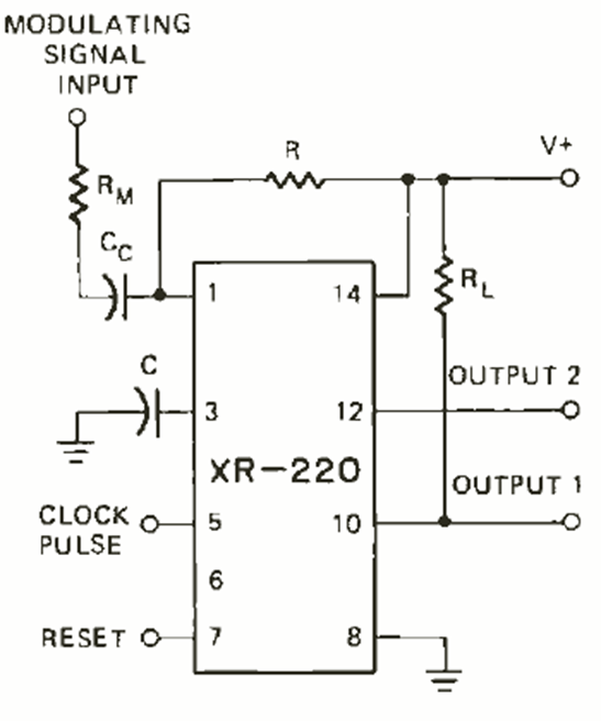 Encontrado en la revista Radio Electronics de octubre de 1972, este circuito genera pulsos modulados. Los condensadores C y R determinan la frecuencia. Los resultados son complementarios.