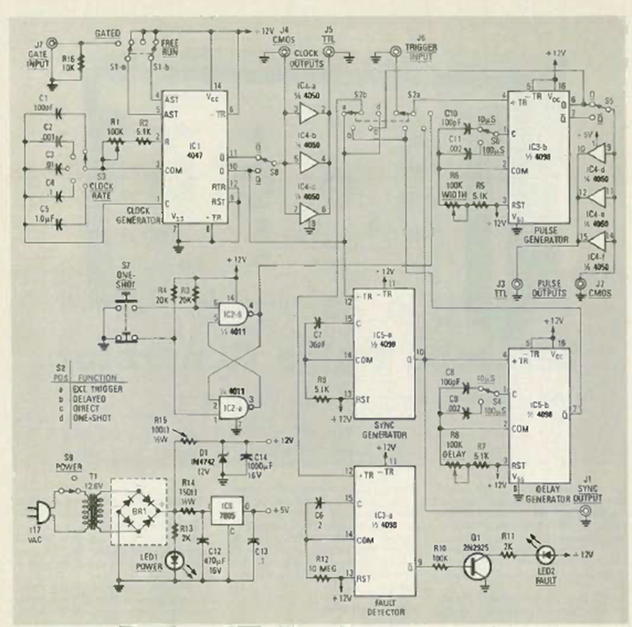 Este sofisticado generador de impulsos fue encontrado en una revista de Radio Electrónica de noviembre de 1985. Genera impulsos de 1 a 100 us.