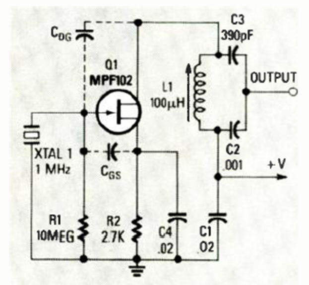 Este oscilador fue encontrado en la revista Radio Electronics de noviembre de 1986. La frecuencia depende del cristal y puede alcanzar varios megahertz. El transistor admite equivalentes.