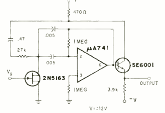 Este oscilador controlado por voltaje o VCO fue encontrado en una revista Radio Electronics de julio de 1970. El Operador debe ser alimentado por una fuente simétrica. La frecuencia depende de los capacitores.