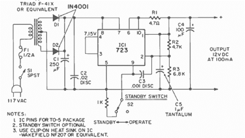 Usando el circuito integrado 723, esta fuente tiene la tensión determinada por R2 y R3, el cual se puede cambiar. El circuito es de una revista Radio Electronics de julio de 1971.
