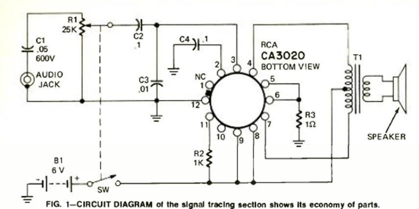 Este circuito, que apareció en una revista Radio Electronics de septiembre de 1972, emplea el CA3020 de RCA, un amplificador multipropósito en una carcasa metálica redonda de 12 pinos.