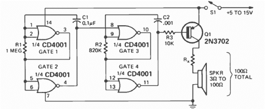 Esta sirena modulada se encontró en la revista Radio Electronics de diciembre de 1974. Se puede utilizar una etapa de salida de mayor potencia como el circuito anterior. La frecuencia y el efecto vienen dados por C1 y C2.