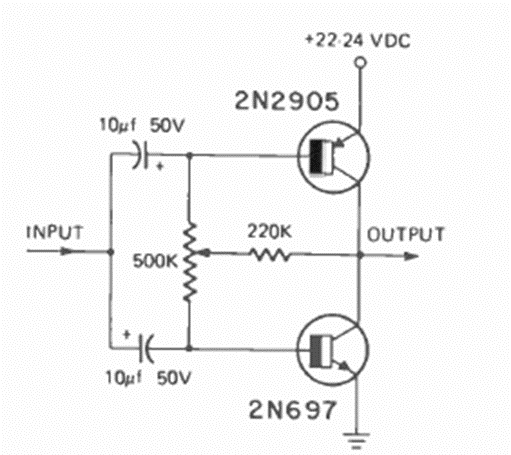 Esta etapa de salida diferente se encontró en la revista Radio Electronics de octubre de 1974. El circuito utiliza transistores complementarios de propósito general y es de baja potencia.