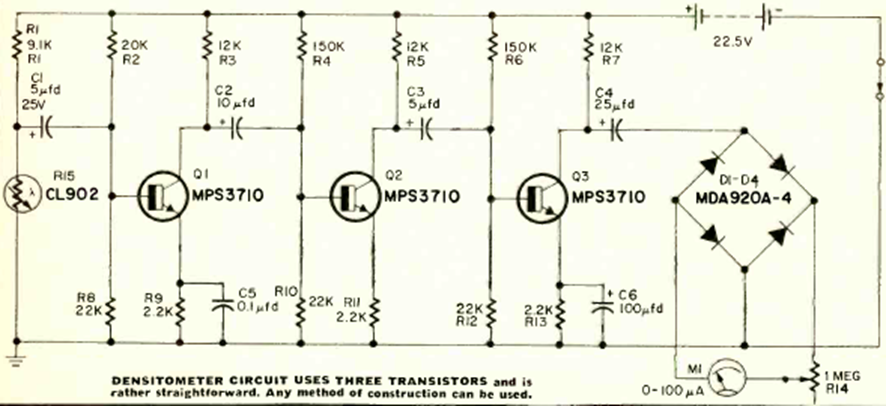 Este circuito utilizado en aplicaciones fotográficas fue encontrado en la revista Radio Electronics en mayo de 1971. El circuito se utiliza para medir transparencias utilizando un LDR y una fuente de luz alterna como sensor.