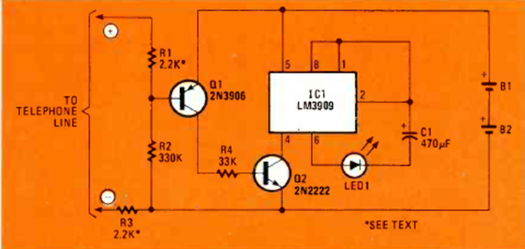 Este circuito para teléfonos analógicos comunes lo encontré en la revista Radio Electronics de marzo de 1982. Aplica para líneas que tienen una extensión (segundo teléfono).