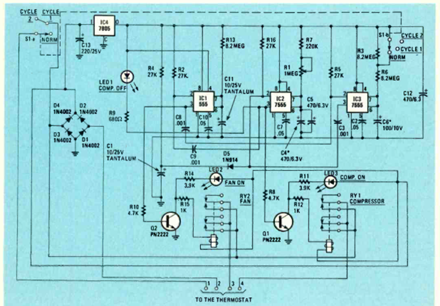 Este circuito, para controlar sistemas de aire acondicionado, fue encontrado en la revista Radio Electronics de julio de 1984. El circuito es para tipos antiguos de la época que no tenían control por microcontrolador.
