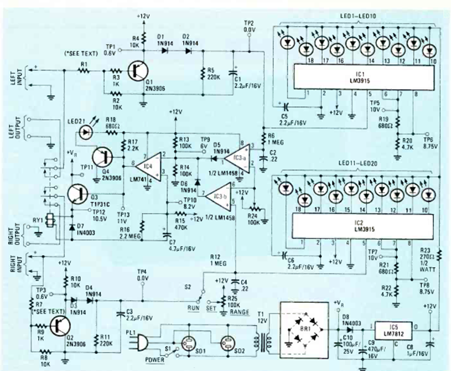 Este sofisticado circuito indicador de barra móvil con el LM3915 es de una revista de Radio Electronics de mayo de 1985. El circuito de dos canales incluye la fuente de alimentación.