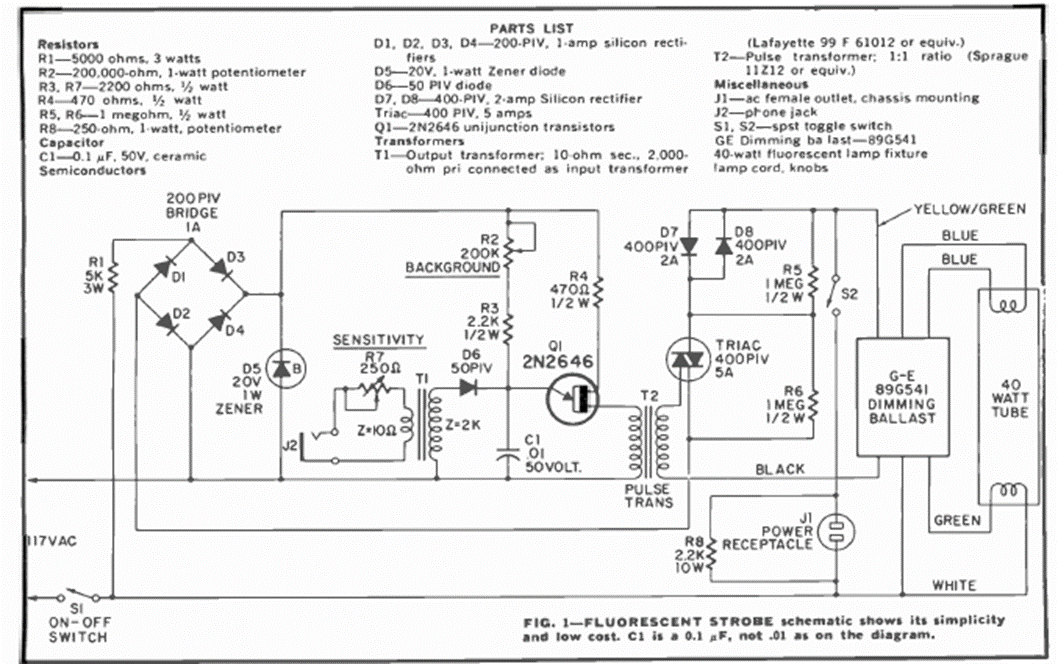 Este circuito de efecto de luz fue encontrado en la revista Radio Electronics de julio de 1971. El circuito se alimenta de la red de 110 V, pero se puede cambiar dependiendo del triac y de la lámpara.
