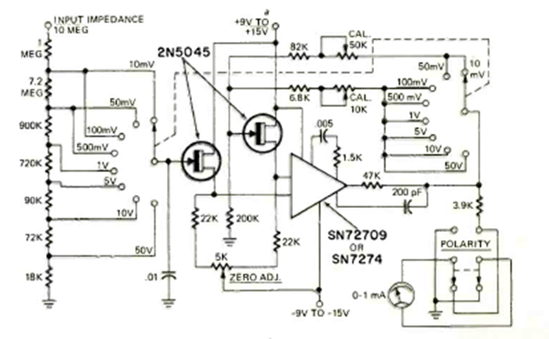 Este circuito fue encontrado en la revista Radio Electronics de septiembre de 1972. El circuito utiliza un amplificador operacional de la época y utiliza una fuente simétrica de 9 V.