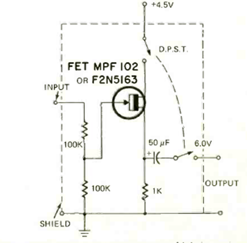 Este circuito para micrófonos de alta impedancia tiene una salida de baja impedancia. El circuito es de Radio Electronics de diciembre de 1972. La energía proviene de 3 baterías pequeñas.