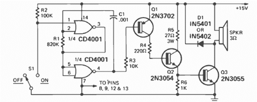 Este oscilador de alarma se encontró en la revista Radio Electronics de diciembre de 1974. El transistor de potencia debe estar equipado con un buen disipador de calor. La frecuencia viene dada básicamente por C1.