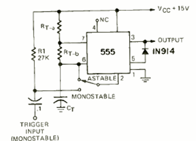 Esta interesante característica permite seleccionar el funcionamiento astable o monoestable de un 555. El circuito tiene valores de componentes según el funcionamiento deseado.
