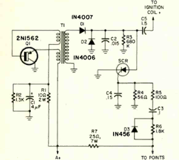 Este sistema de encendido por descarga capacitiva con 1 transistor y 1 SCR se encontró en la revista Radio Electronics en abril de 1972. El transistor es de alta potencia y debe montarse en un radiador de calor.