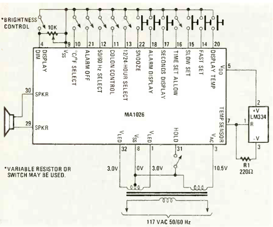 Esta mejora del reloj y termómetro digital MA1026, mejorado respecto a los dos circuitos anteriores, es de la misma revista Radio Electronics de febrero de 1981. El circuito lleva un transformador con tensiones especiales.