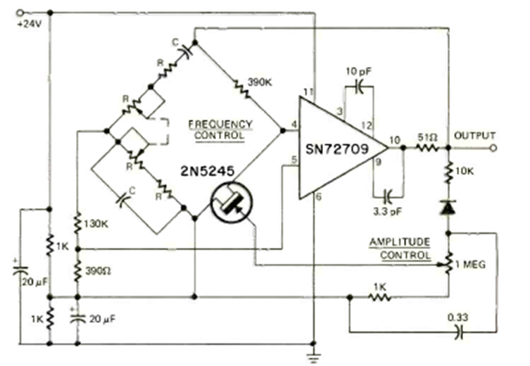 Este circuito oscilador de puente de Viena utiliza un amplificador Texas Instruments 709. Lo encontramos en un artículo de la revista Radio Electronics de septiembre de 1972. La alimentación se suministra mediante una tensión de 24 V.