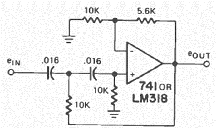 Usando el 741, este circuito básico se encontró en la revista Radio Electronics de noviembre de 1973. La fuente de alimentación debe ser simétrica. Los componentes se pueden recalcular para otras frecuencias.