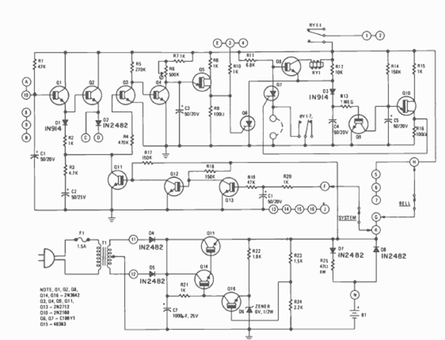 Este circuito se obtuvo de la revista Radio Electronics de septiembre de 1977. El circuito se basa integramente en transistores y dos SCR. La alimentación se proporciona con la inclusión de una batería.