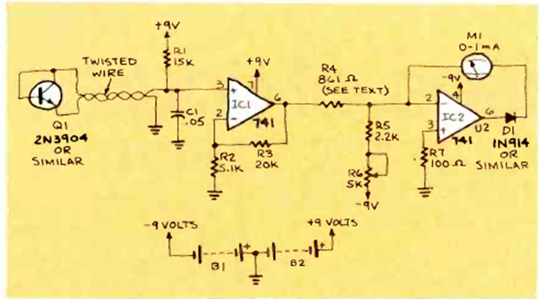 Este circuito de termómetro de dos operadores se encontró en la revista Radio Electronics de septiembre de 1982. El sensor consta de un transistor de propósito general.