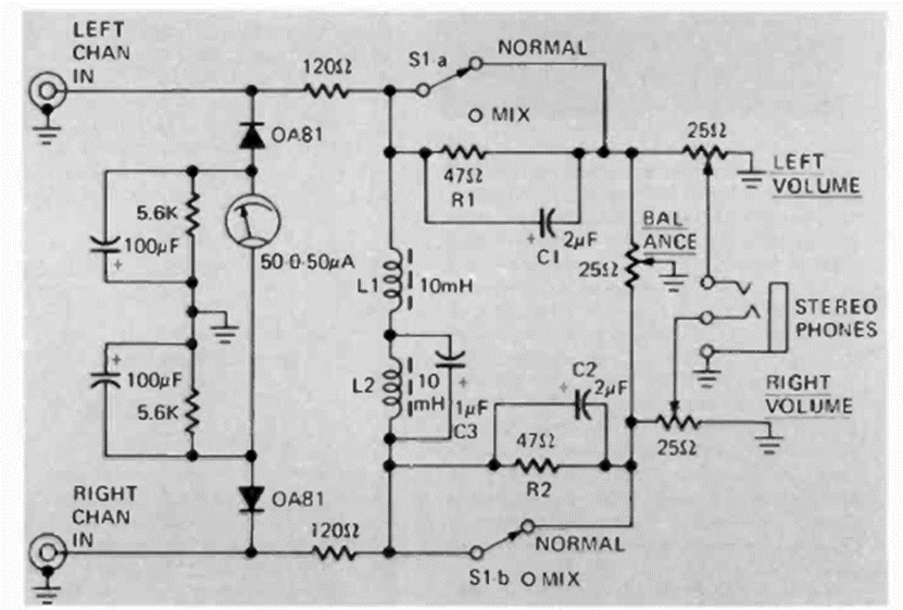 Este circuito procedente de una antigua Radio Electrónica sirve para conectar unos auriculares a la salida de amplificadores que no disponen de este tipo de salida. La revista es de agosto de 1974 y los auriculares son de baja impedancia.