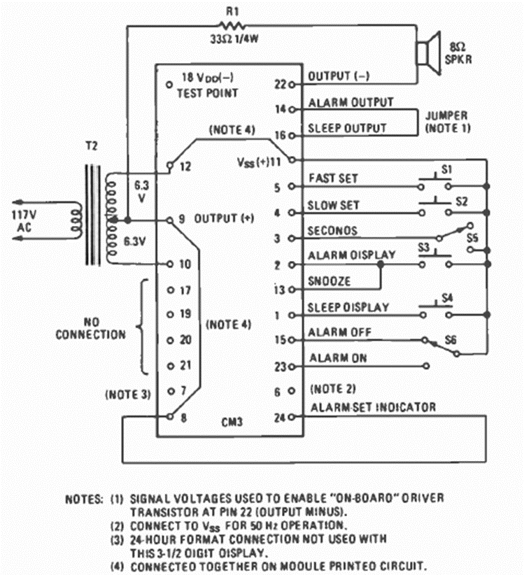 Este circuito es de un módulo de reloj digital Fairchild que se muestra en la revista Radio Electronics de marzo de 1977. El circuito requirió pocos elementos externos, incluido un transformador común.