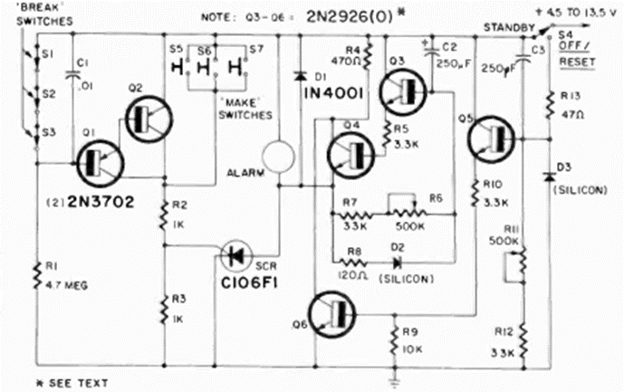 Encontramos este circuito en la revista Radio Electronics de julio de 1971. El circuito activa un Sonalert o un relé para un sistema de alerta de mayor potencia.