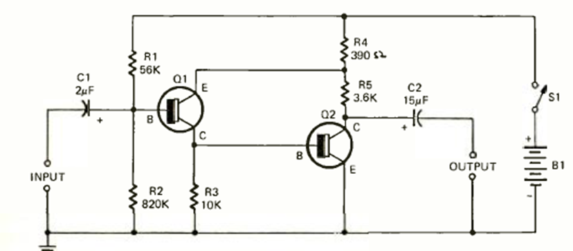 Esta configuración con dos transistores complementarios de propósito general se encontró en la revista Radio Electronics de diciembre de 1972. La alimentación está entre 6 y 12 V.