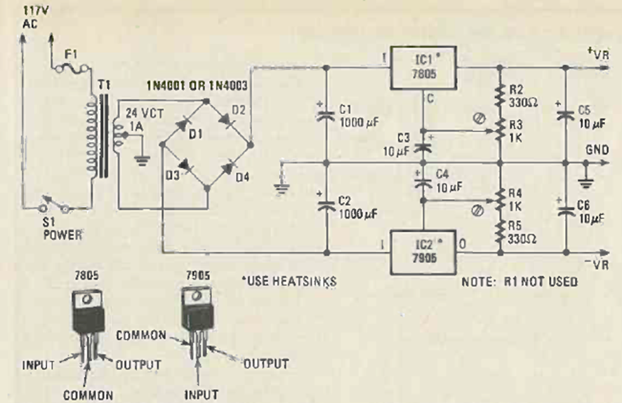 Otra versión de las muchas fuentes simétricas que tenemos en esta sección. Esto es de una revista de Radio Electronics de mayo de 1980. La corriente máxima es 1 A. Los reguladores deben estar equipados con disipadores de calor.