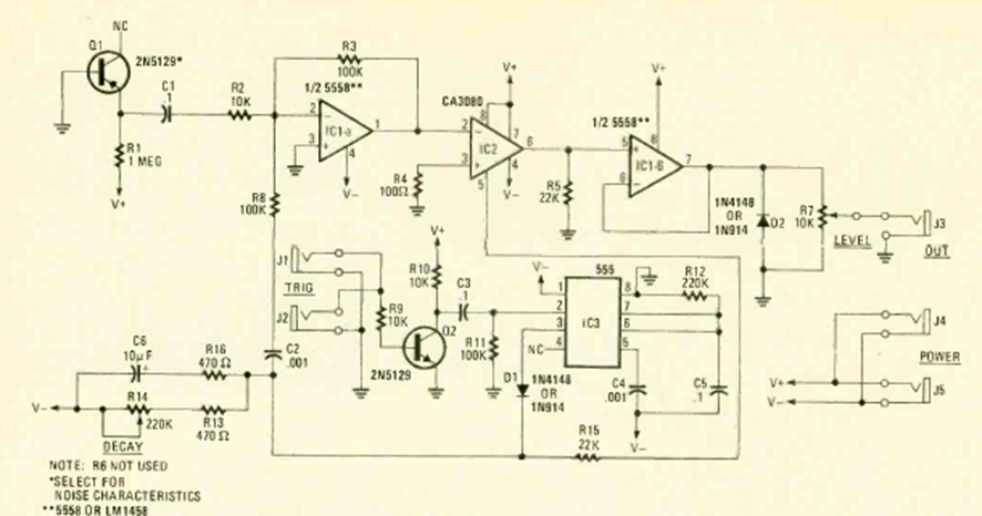 Este circuito que simula el sonido de un tambor es parte de un artículo publicado en la revista Radio Electronics en diciembre de 1979. El circuito tiene ajuste de decay y la alimentación debe ser proporcionada por una fuente simétrica.
