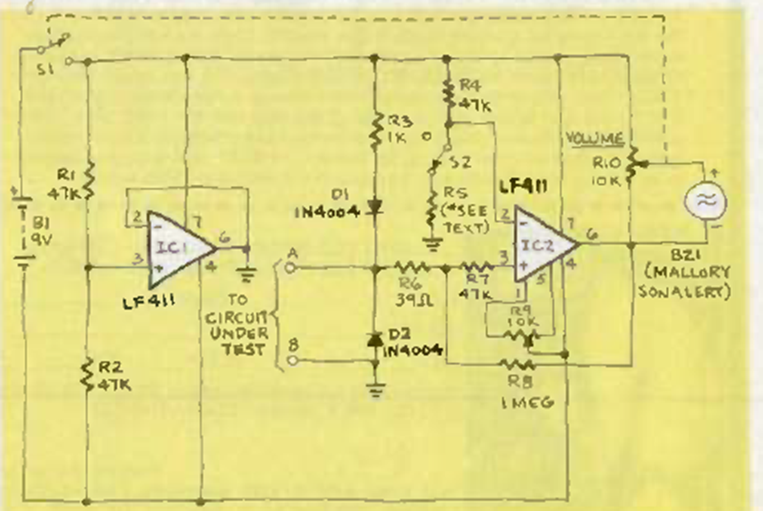Este sofisticado circuito con dos amplificadores operacionales LF411 apareció en la revista Radio Electronics en noviembre de 1984. El circuito utiliza un zumbador Mallory como indicador.