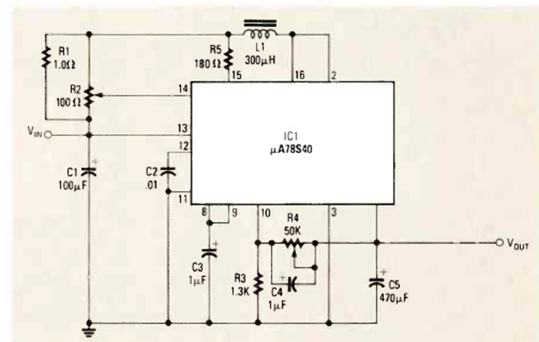 Este regulador reductor se encontró en la revista Radio Electronics de diciembre de 1985. El circuito tiene una tensión de entrada de 25V.