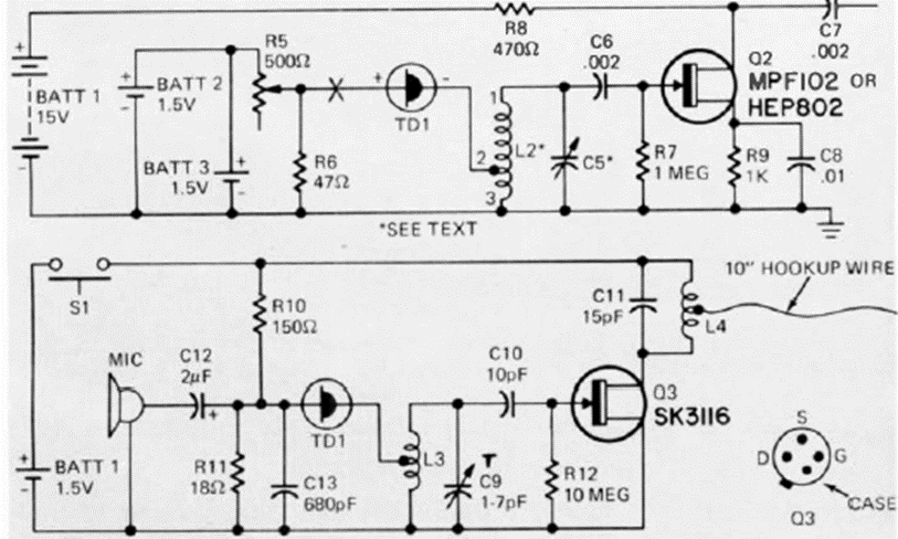 Este circuito lo encontramos en una Radio Electrónica de agosto de 1974. Las frecuencias generadas dependen de los circuitos LC y además tiene una etapa de modulación, funcionando como un pequeño transmisor experimental.