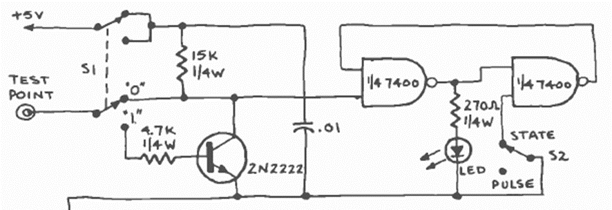 Esta punta lógica se bloquea en presencia de impulsos. El circuito TTL fue sugerido por la revista Radio Electronics de agosto de 1977. La alimentación debe ser de 5 V.