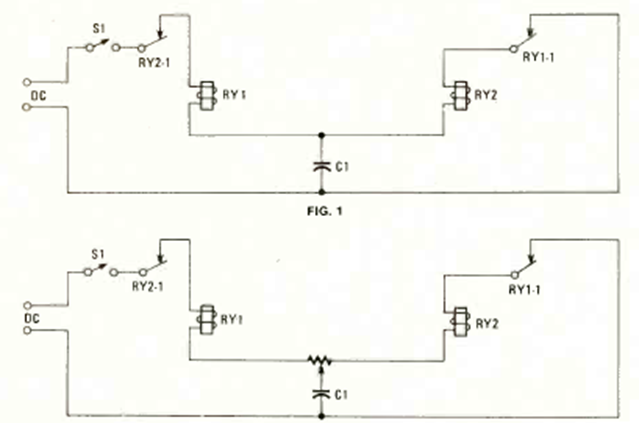 En la figura tenemos dos posibles configuraciones para multivibradores con relé. La idea surge de un artículo de la revista Radio Electronics de abril de 1980. Los relés son tipos sensibles cuya tensión depende de la alimentación.
