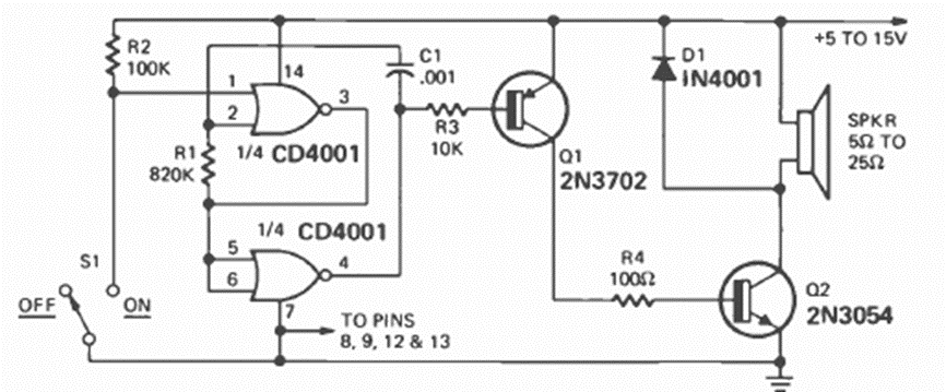 Este circuito de alarma fue recomendado por la revista Radio Electronics en diciembre de 1974. El transistor de potencia puede proporcionar salidas de 0,25 W a 11 E dependiendo de la fuente de alimentación y debe montarse en un disipador de calor.