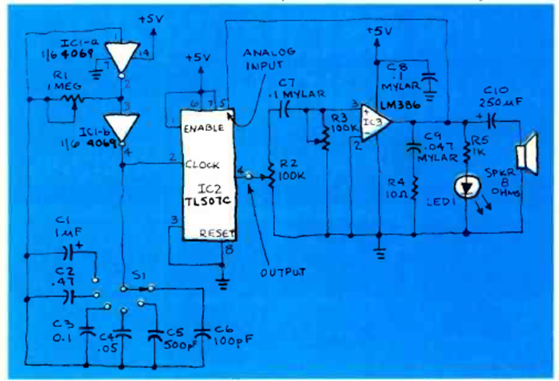 Este circuito genera diferentes tipos de sonidos y puede usarse como juguete. El circuito es de Radio Electronics de enero de 1983. El amplificador se puede sustituir por uno más moderno.