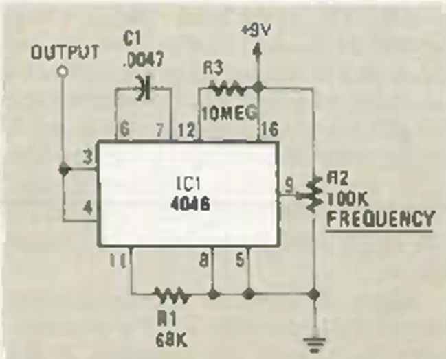 La frecuencia de este circuito se puede variar desde cero. El circuito utiliza CMOS 4046 y se encontró en la revista Radio Electronics de noviembre de 1984. La frecuencia básica viene dada por C1.