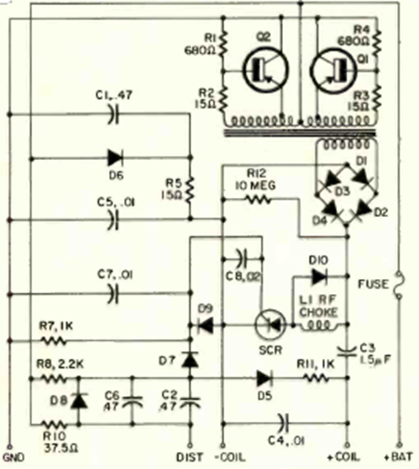 Este circuito es de una Radio Electronics de abril de 1972. El circuito utiliza transistores de potencia de la época y se utiliza en cajas con placas de platino.