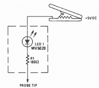 Este circuito de dos componentes fue sugerido por la revista Radio Electronics en su edición de agosto de 1977. El LED puede ser de cualquier color y la energía proviene del propio circuito bajo prueba.