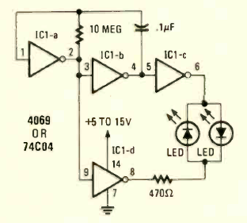 Este circuito simple fue encontrado en la revista Radio Electronics de mayo de 1979. El circuito tiene la frecuencia de los LED determinada por el capacitor. La resistencia de 470 ohmios se puede cambiar hasta 2,2 k ohmios dependiendo del brillo del LED deseado.