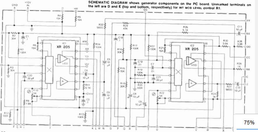 Este circuito es de la revista Radio Electronics de julio de 1973. El circuito está basado en el XR-205, popular en ese momento para este tipo de aplicaciones. El circuito genera de 100 KHz a 150 kHz.
