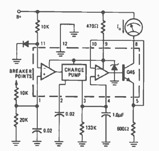 Este circuito para vehículos con contactos de encendido mecánico (platinados) lo encontramos en la revista Radio Electronics de octubre de 1977. El circuito funciona con 12 V.
