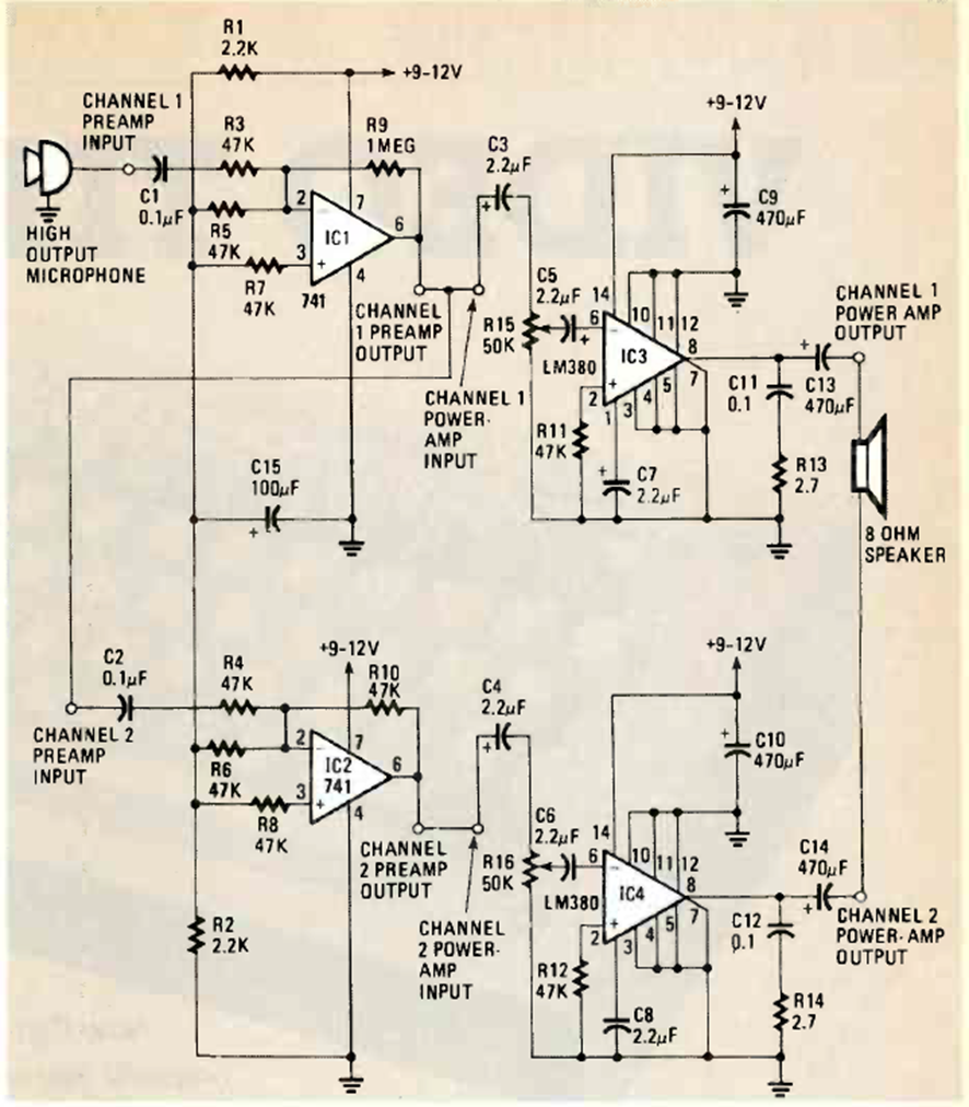 Este amplificador de PA o megafonía con unos pocos vatios de potencia se encontró en la revista Radio Electronics de marzo de 1986. Utiliza dos circuitos integrados LM380 unidos para obtener mayor potencia.