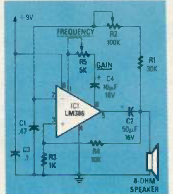 Circuitos como este, aprovechando el amplificador de audio LM386, están disponibles en otras fuentes en esta misma sección. Esto es de la revista Radio Electronics de agosto de 1986.