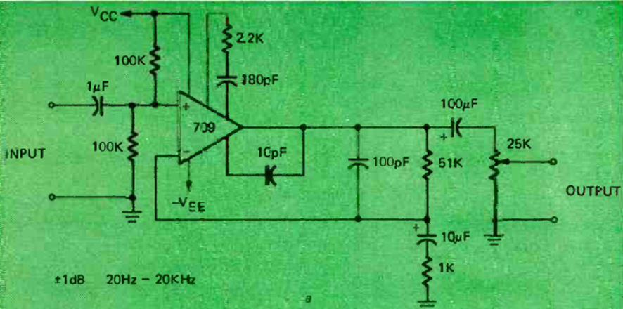 Con una distorsión inferior a 1 dB de 10 Hz a 20 kHz, este circuito se encontró en la revista Radio Electronics de diciembre de 1972. El amplificador es de un tipo que precedió al 741, el 709.