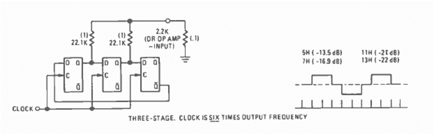 Este circuito de 3 pasos para generar señales digitales se encontró en la revista Radio Electronics de noviembre de 1976. La frecuencia máxima depende de los flip flops utilizados.