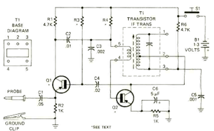 Este circuito de dos transistores se encontró en la revista Radio Electronics de agosto de 1972. La bobina es un transformador IF común para radios de transistores. La señal generada es rica en armónicos.
