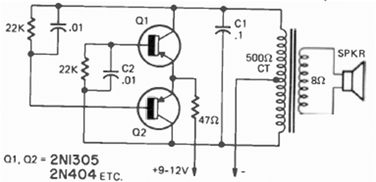 El circuito es adecuado para llamadas en un hogar y fue publicado en la revista Radio Electronics en septiembre de 1974. El transformador es para la salida de radios de transistores o amplificadores y los transistores son para propósito general.