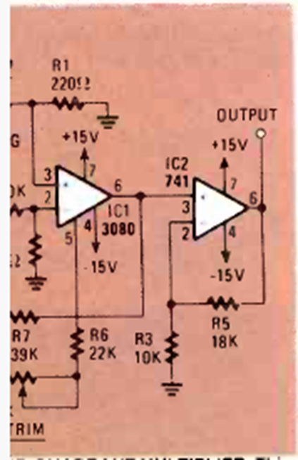 Este circuito, que apareció en la revista Radio Electronics de julio de 1983, utiliza un amplificador operacional de transconductancia. La fuente de alimentación debe ser simétrica.
